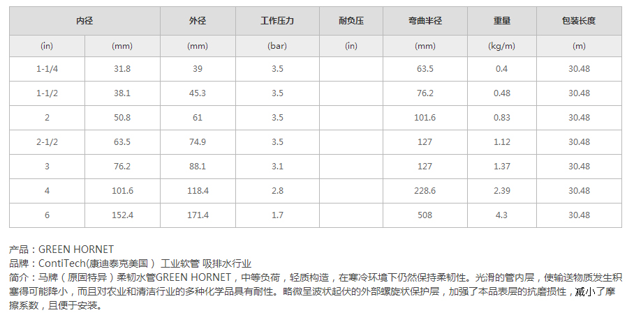 技術參數內層:黑色Plioflex?合成橡膠,RMAC級(有限耐油)增強層:多層合成纖維纏繞外層:紅色Plioflex?合成橡膠(環裹壓印),RMAC級(有限耐油)溫度:-32°C到82°C(-25°F到180°F)